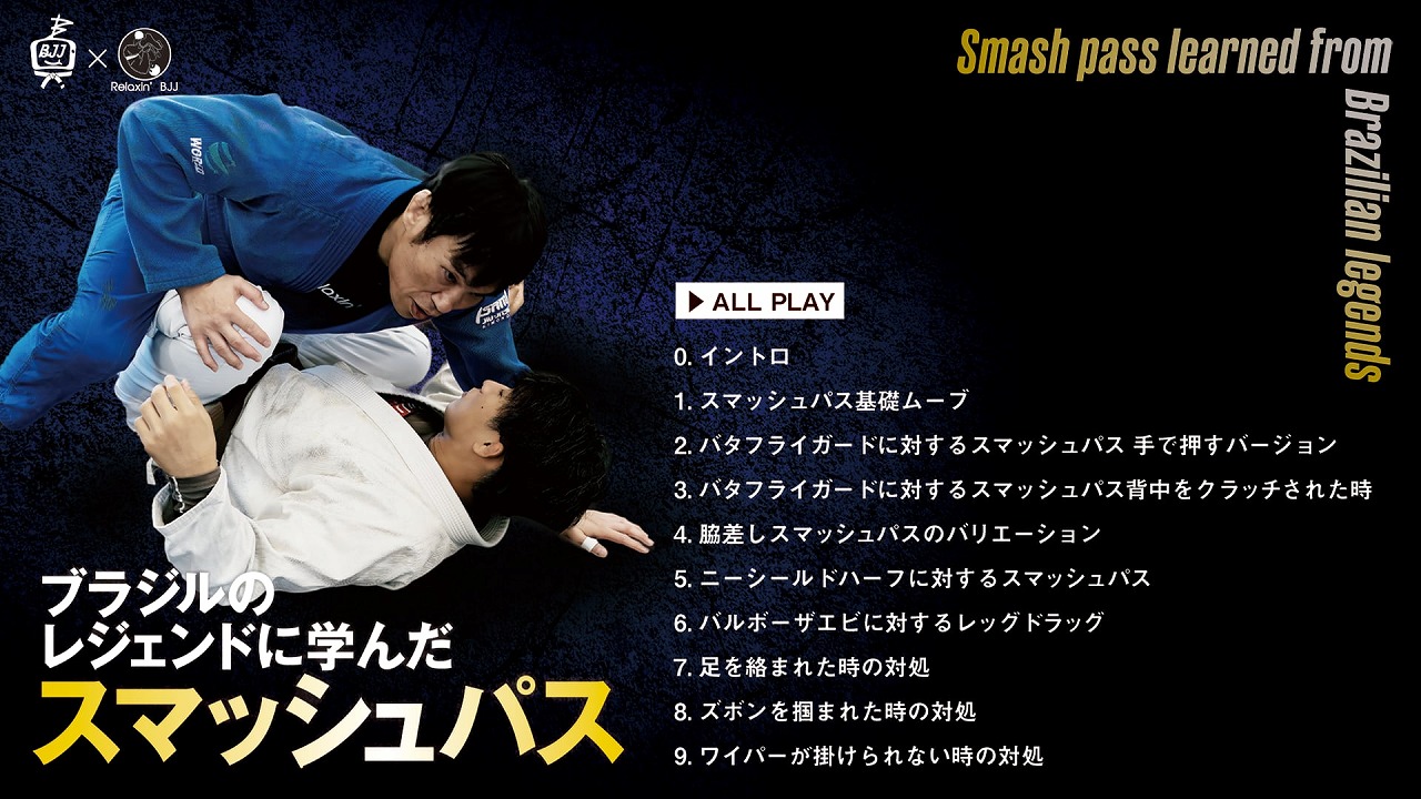 今回の教則では、ブラジルの名門バルボーザ道場で、ムリーロ・サンタナ、チアゴ・アウベスら世界トップ選手たちに浴びせられたスマッシュパスの技術を日本に持ち帰り、独自に研究・発展させた技術を徹底公開します。